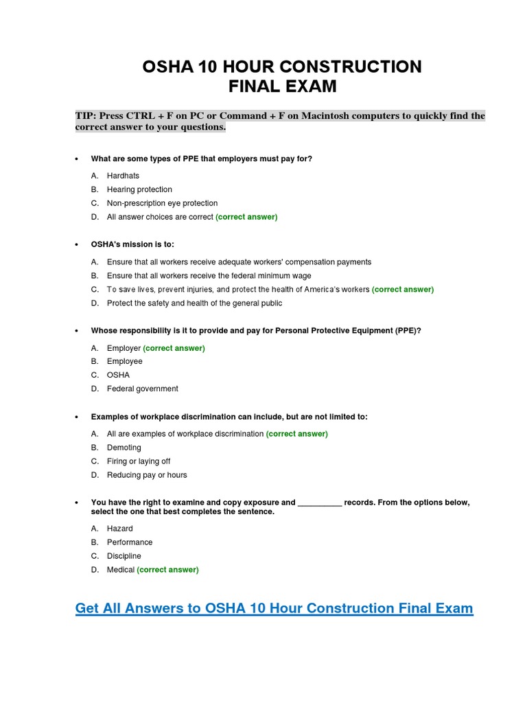 Osha 10 Hour Construction Final Test Answer Key Care Sa