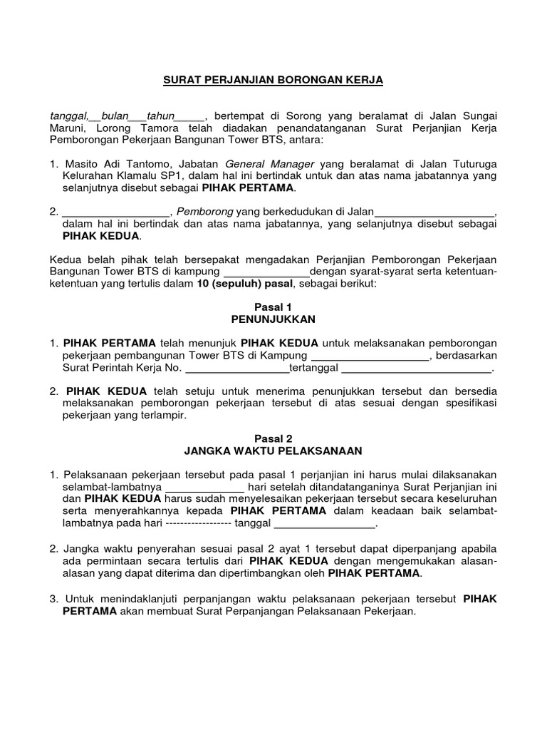 Contoh Surat Perjanjian Kerja Borongan Tower